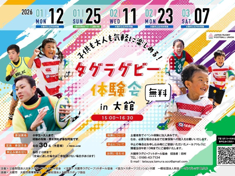 公益財団法人日本ラグビーフットボール協会(JRFU)は、「タグラグビー普及拠点事業」の一環として、秋田県大館市で、「タグラグビー体験会 in 大館(秋田県)」を開催いたします。 小・中・高校生から大人までみんなで一緒に楽しめる!笑顔溢れるタグラグビー体験会、男女・経験は問いませんので、ぜひこの機会にご参加ください!皆様のお申込みをお待ちしています。 ■タグラグビー体験会 in 大館(秋田県) 実施概要 日程・会場: ①2026年1月12日(月・祝)15:00~16:30 大舘市立比内体育館 ②2026年1月25日(日)15:00~16:30 大舘市花岡総合スポーツ公園体育館 ③2026年2月11日(水・祝)15:00~16:30 大舘市立比内体育館 ④2026年2月23日(月・祝)15:00~16:30 大舘市立比内体育館 ⑤2026年3月7日(土)15:00~16:30 大舘市立比内体育館 主 催:(公財)日本ラグビーフットボール協会 主 管:大館市ラグビーフットボール協会 協 力:スポーツコミッション大館、(一社)秋田ノーザンブレッツR.F.C 後 援:大館市、大館市教育委員会、(一社)大館市スポーツ協会 対 象:小学生~大人(男女、経験・未経験は問いません) 参加費:無料 定 員:各回30名程度 ※先着順 ■申込方法 下記フォームよりお申込みください。 https://business.form-mailer.jp/fms/507868d8321191 申込締切:各回2日前まで(定員に達した場合はご参加いただけない場合があります) ■本イベントに関するお問い合わせ先 大館市ラグビーフットボール協会 担当者:田村 TEL:0186-43-7134 E-mail:tetsuya.tamura.sco@gmail.com |