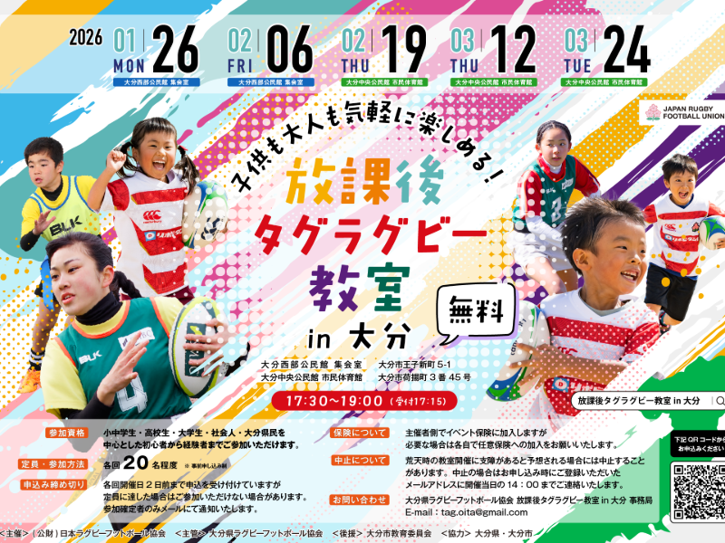 公益財団法人日本ラグビーフットボール協会(JRFU)は、「タグラグビー普及拠点事業」の一環として、大分県大分市で、「放課後タグラグビー教室 in 大分」を開催いたします。 子どもも大人もみんなで一緒に楽しめる!笑顔溢れる放課後タグラグビー教室 in 大分。男女・経験は問いませんので、ぜひこの機会にご参加ください!皆様のお申込みをお待ちしています。 ■放課後タグラグビー教室 in 大分 実施概要 日程・会場: ①2026年1月26日(月)17:30~19:00 大分西部公民館 集会室 ②2026年2月6日(金)17:30~19:00 大分西部公民館 集会室 ③2026年2月19日(木)17:30~19:00 大分中央公民館 市民体育館 ④2026年3月12日(木)17:30~19:00 大分中央公民館 市民体育館 ⑤2026年3月24日(火)17:30~19:00 大分中央公民館 市民体育館 主 催:(公財)日本ラグビーフットボール協会 主 管:大分県ラグビーフットボール協会 後 援:大分市教育委員会 協 力:大分県・大分市 対 象:小中学生・高校生・大学生・社会人・大分県民を中心とした初心者~経験者 参加費:無料 定 員:各回20名程度 ※事前申し込み制 ■申込方法 下記フォームよりお申込みください。 https://business.form-mailer.jp/fms/697ed96d205873 申込締切:各回2日前まで(定員に達した場合はご参加いただけない場合があります) ■本イベントに関するお問い合わせ先 大分県ラグビーフットボール協会 放課後タグラグビー教室 in 大分 事務局 E-mail:tag.oita@gmail.com |