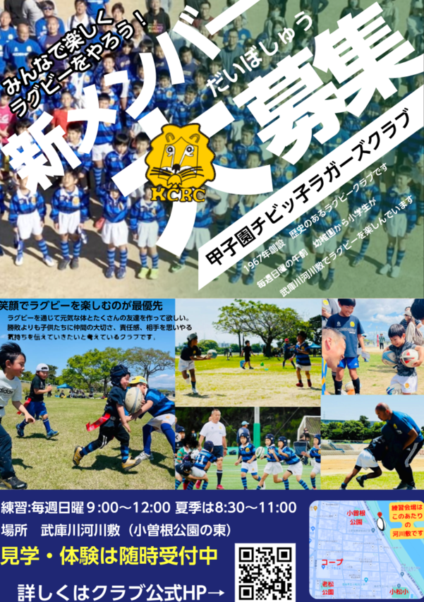 もちろん未経験者も大歓迎! 保護者の方の不安解消コーナーや ラグビー用品のバザーもやってるよ。 |