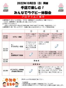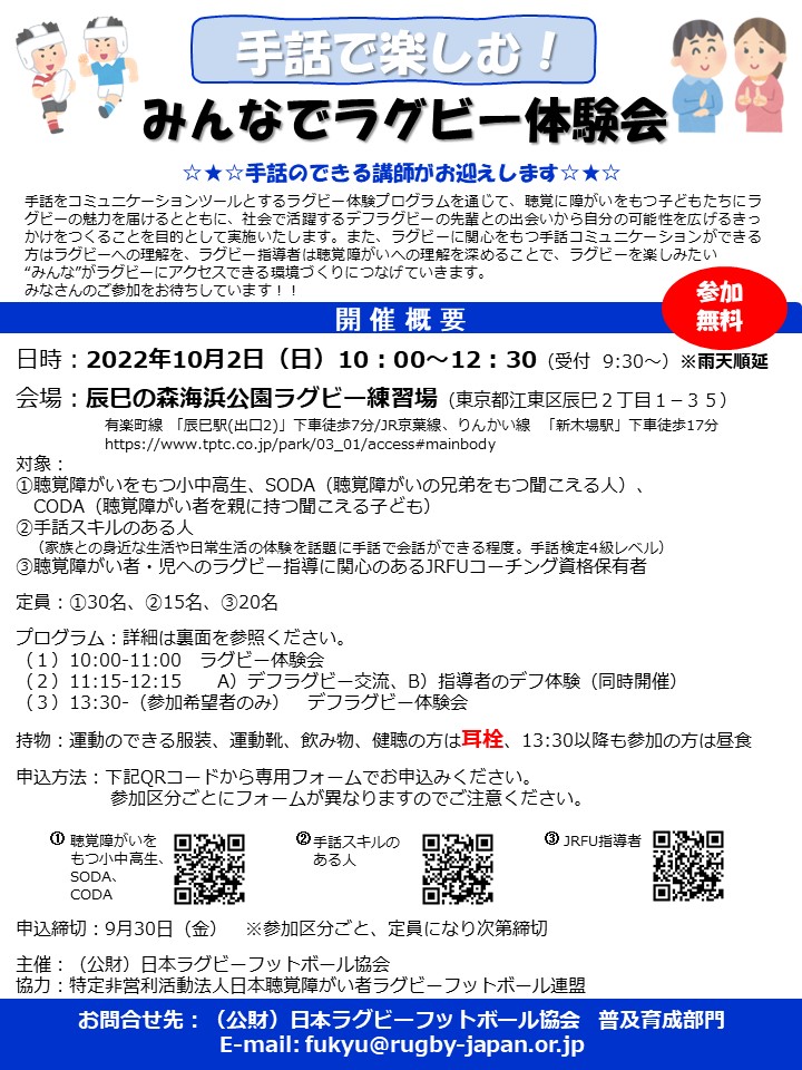公益財団法人日本ラグビーフットボール協会(JRFU)は、特定非営利活動法人日本聴覚障がい者ラグビーフットボール連盟の協力のもと、手話で楽しむ!みんなでラグビー体験会を下記のとおり実施いたします。