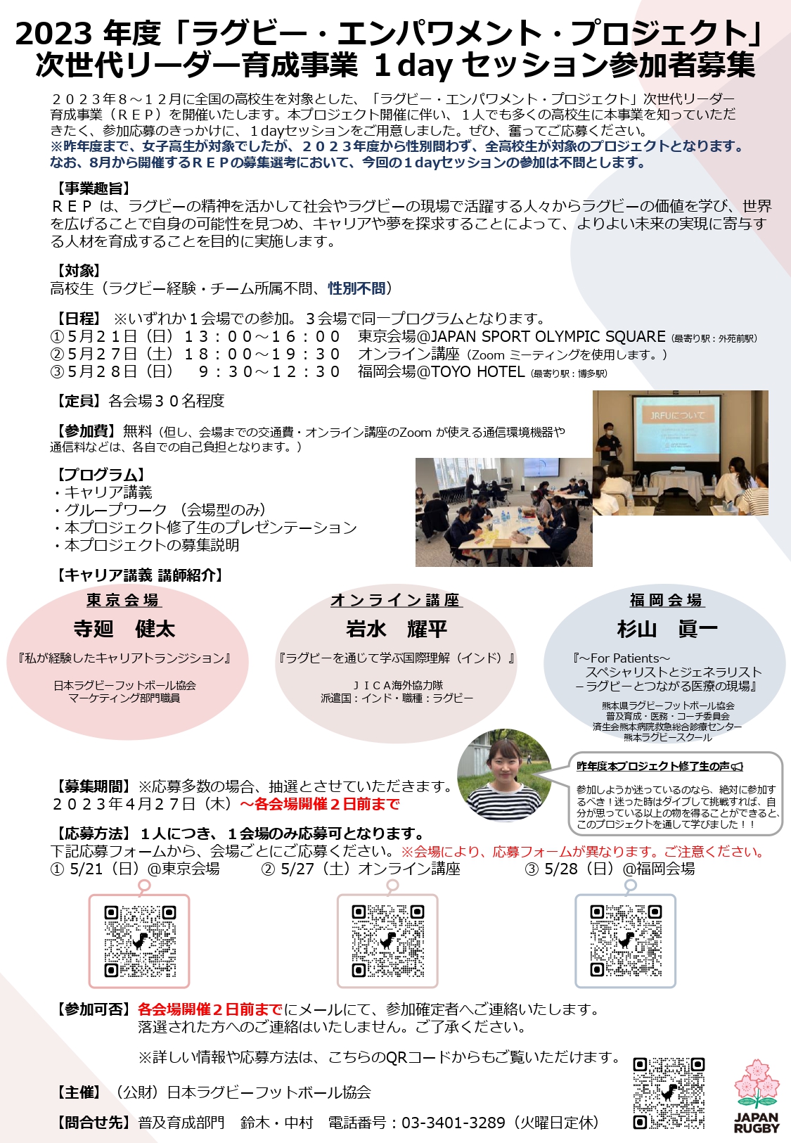 弊協会では、「品位-Integrity-」「情熱-Passion-」「結束-Solidarity-」「規律-Discipline-」「尊重-Respect-」という精神を掲げる「ラグビー憲章」を広く発信することで、共生社会への理解を促進し、ダイバーシティ&インクルージョンの実現に寄与するための施策に取り組んでおります。本プロジェクトはその一環として、高校生を対象に昨年度に続き実施する次世代リーダー育成事業となります。今回、本プロジェクト開催に伴い、1人でも多くの高校生に本事業を知っていただきたく、参加応募のきっかけに、1dayセッションを3会場ご用意しました。ぜひ、奮ってご応募ください。