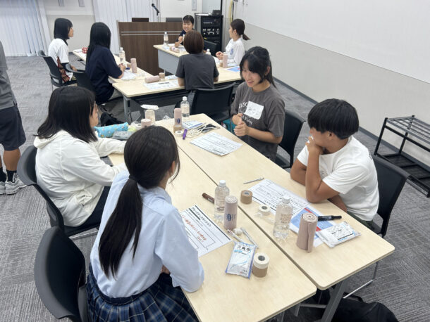 安全対策講座では、現場に立つマネージャーの日々の活動につながる実践的な内容として、スポーツ活動中の三大死因やフィールドでの初期対応の原則をはじめ、脳震盪のリスクや症状、熱中症の予防と発生時の初期対応、外傷等の応急処置法などを中心にお話いただきました。途中、テーピングなどの実技も交えた内容で、お互いにアドバイスをしあいながら、賑やかに活動に取り組むことができました。