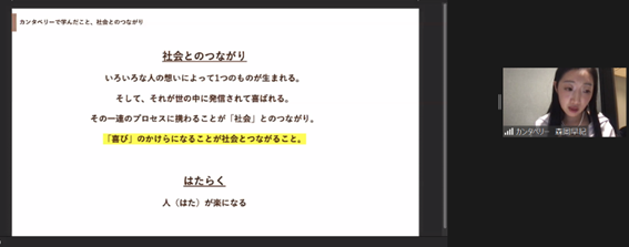 ・ 「どんな小さなことからでも、社会とのつながりを考えて活動していくことが大切だと感じた。また、それが人々の思いのつながりになることを知った」