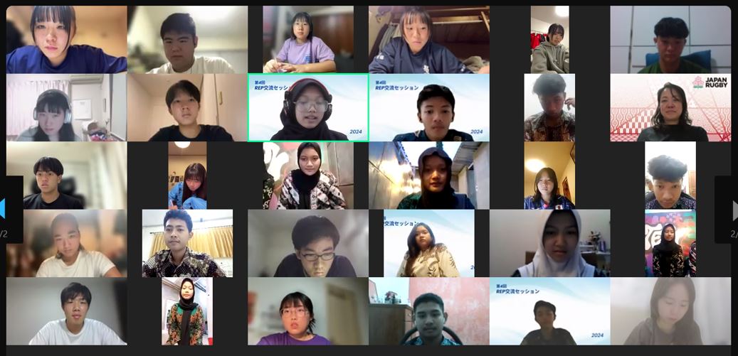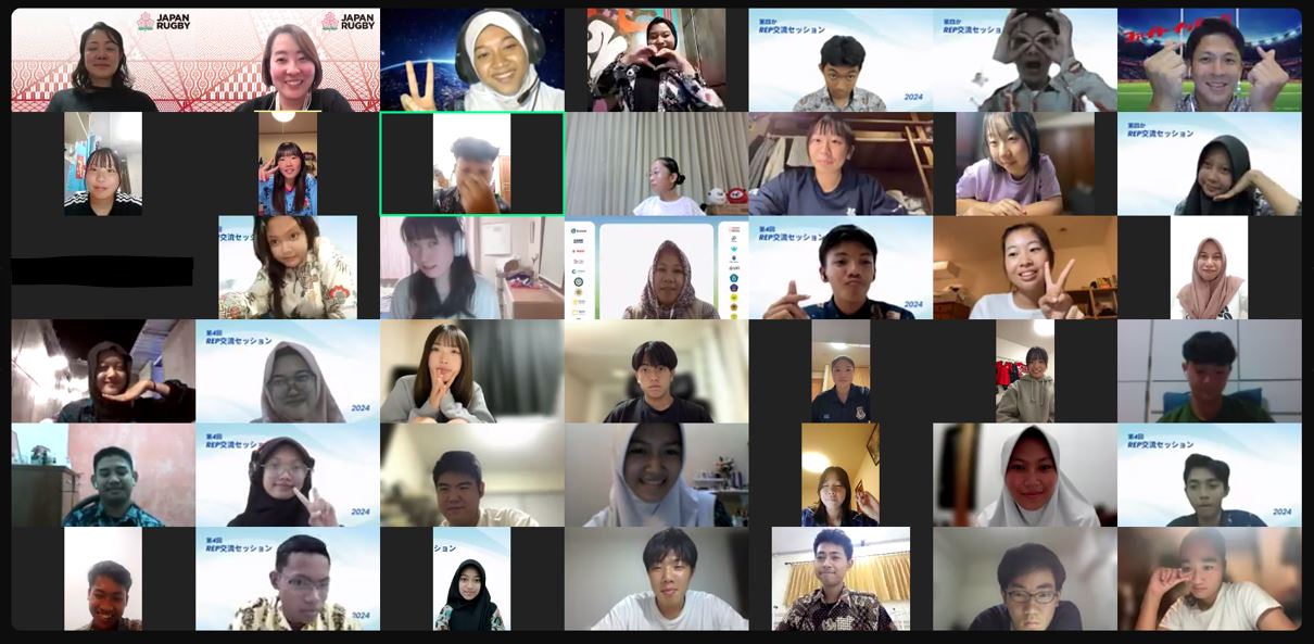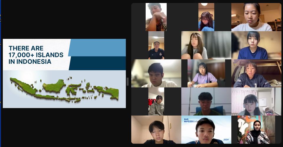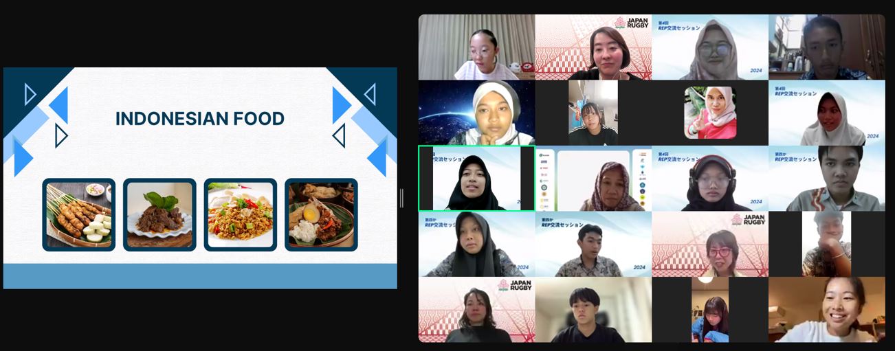 第2部は、石本さんが関わっているインドネシアの高校の生徒と、REPの参加者との交流会です。「日本への関心が高く、参加希望者もとても多かったです」と石本さん。まずは全体の交流セッション。日本からは参加者4人がREP、ラグビー、そして世界的に人気があるアニメと日本の食べ物を紹介。インドネシア側からは国を紹介するVTRの後、オリエンテーションが始まりました。慣れた様子でオンラインでゲームを進めていきます。インドネシアの高校生たちはみな明るく友好的で、今回の企画を楽しみにしてくれていたことが伝わりました。
