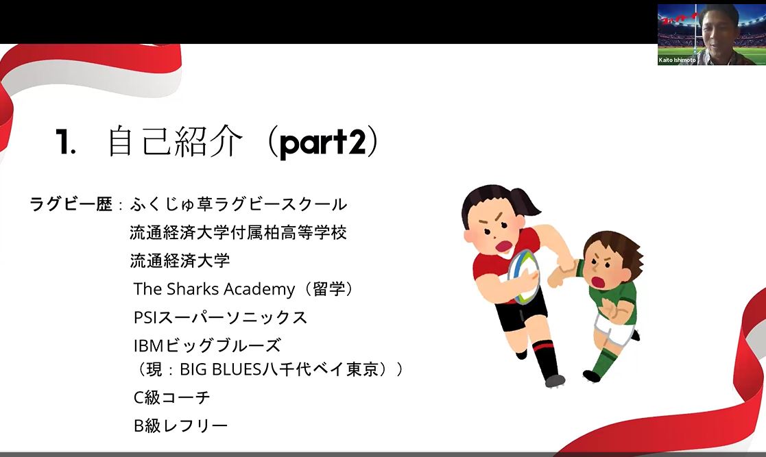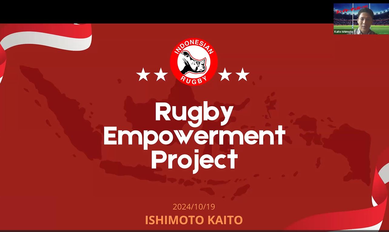 インドネシアは1万8千の島で構成され、面積は日本の5倍、人口は日本の2倍。人口の5割が30歳未満(日本は26㌫)という、若者の多い国です。現在の首都はジャカルタですが、人口が増えすぎたために、今年からヌサンタラに首都機能の移転を開始。全て終わるのは2045年という壮大なプロジェクトです。インドネシアはイスラム教徒が人口の87㌫を占め、人気のスポーツはサッカーやバドミントン。全体的にスポーツへの関心は低く、ラグビーの知名度もありません。一方で日本文化に対する関心は非常に高く、石本さんは各都市の小中高校で日本語や日本文化を伝えながら、ラグビーの普及にも努めています。滞在は2年間ですが、ラグビーを普及させること、インドネシア代表の強化、ラグビーをプレーする場所とアカデミーを作りたいと夢を語りました。