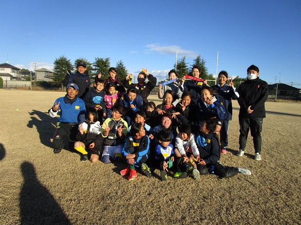 8日は上州名物「空っ風」が吹く、冬らしい天候でしたが、県内の各地から女子プレイヤーが集まりました。最初に全体でタグを使ったアップの活動を小林コーチが指導し、体がほぐれたところで小学生は小林コーチと一緒にタグラグビーの活動を行い、中高生は入澤教諭、鈴木コーチとハンドリングの練習を行いました。