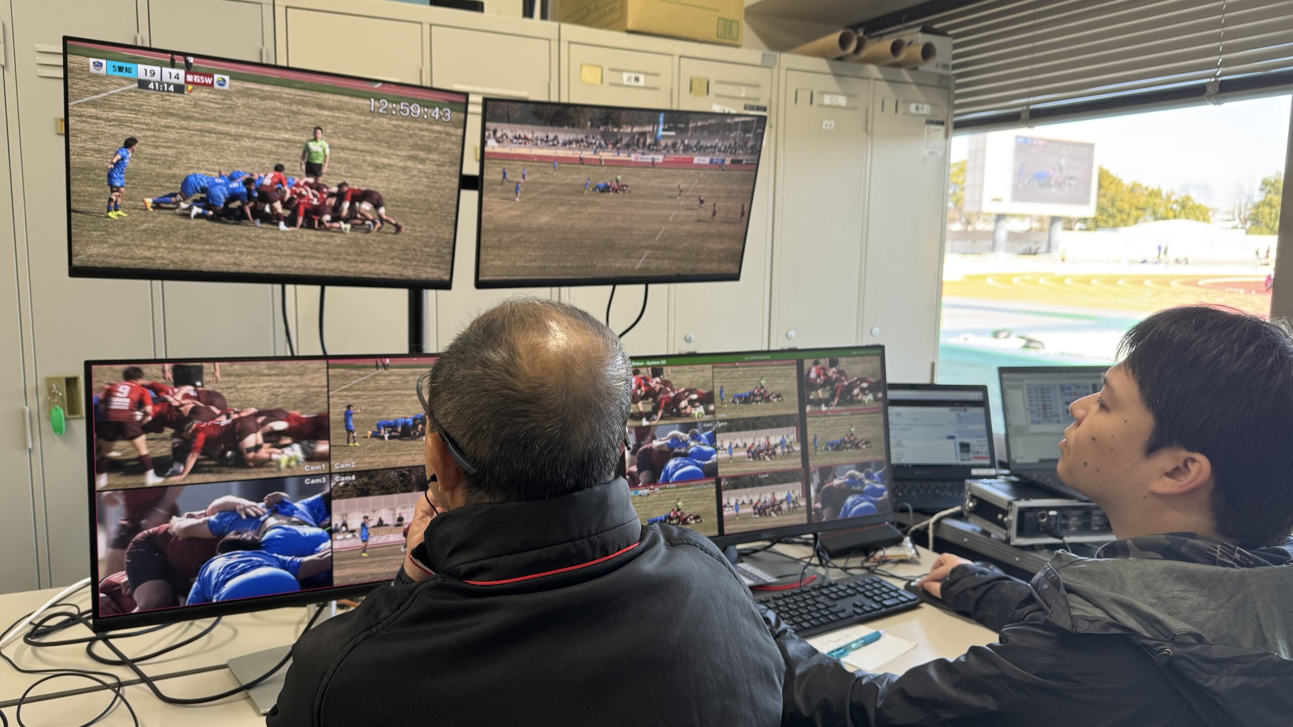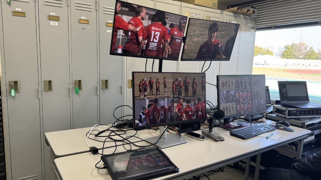写真の右側がオペレーター席・左側がTMO席。中央下にあるタブレットはFPRO(ファールプレーレビューオフィサー用)
