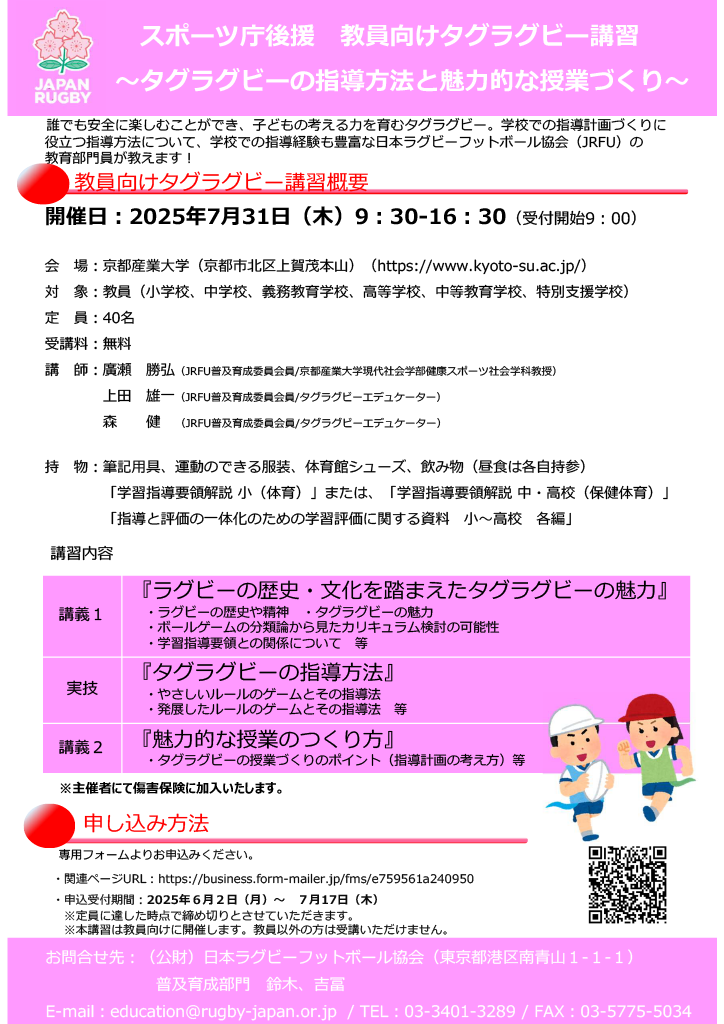 本講習は小学校学習指導要領本文および中学校学習指導要領解説保健体育編に示されたタグラグビーについて、JRFUが従来取り組んできたタグラグビーティーチャー研修会及び免許状更新講習の知見を基に、教員の方々を対象に開催します。