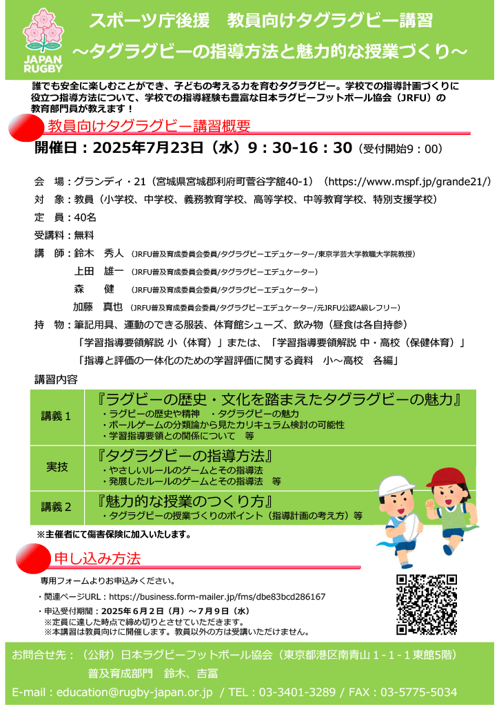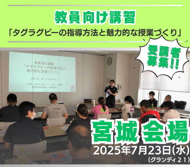 本講習は小学校学習指導要領本文および中学校学習指導要領解説保健体育編に示されたタグラグビーについて、JRFUが従来取り組んできたタグラグビーティーチャー研修会及び免許状更新講習の知見を基に、教員の方々を対象に開催します。