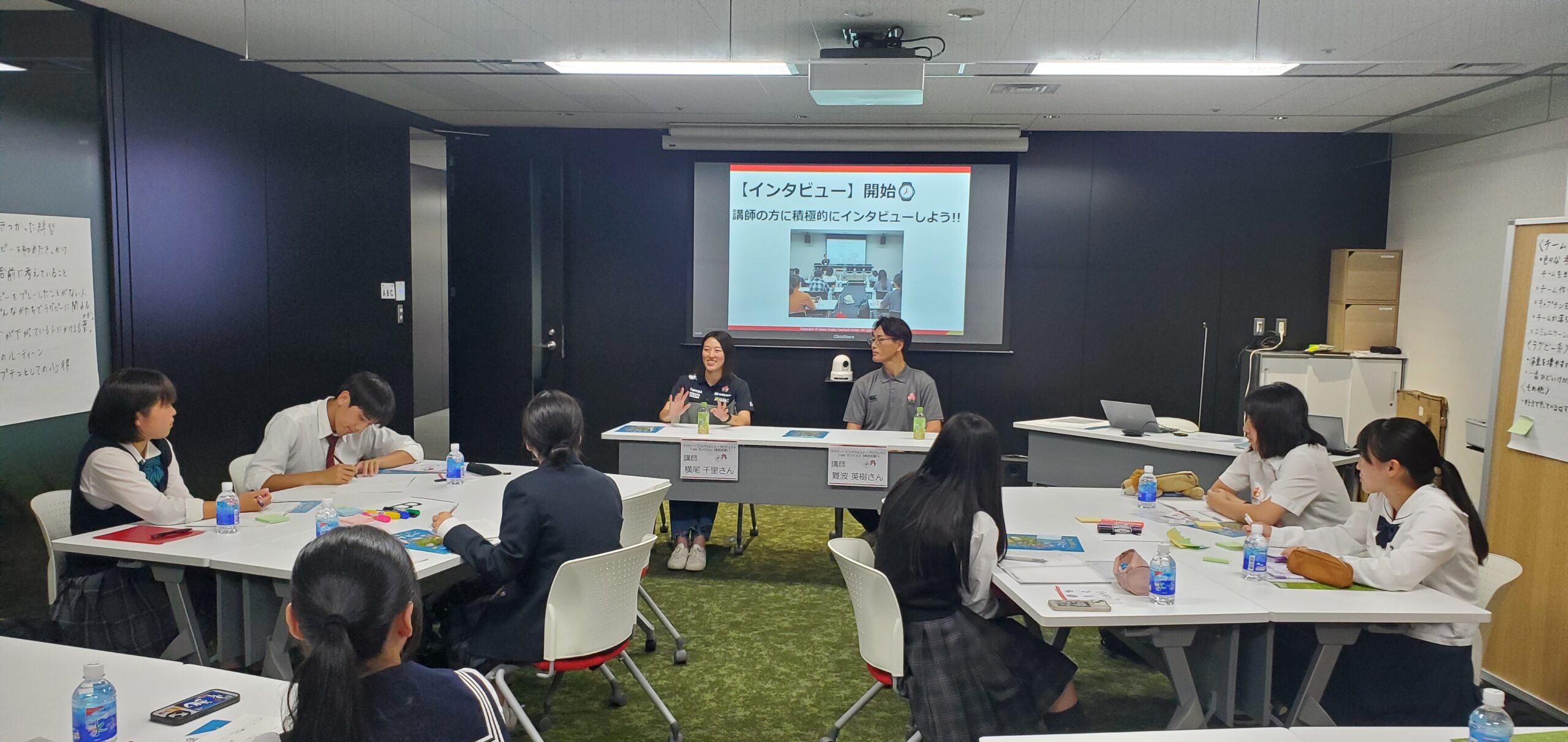 5月24日のセッションは日本協会で行われ、12名が参加しました。この日、インタビュー講義を行ったのは元日本代表の二人。男子日本代表でCTBとして活躍、2003年のワールドカップにも出場したトヨタ自動車勤務の難波英樹さんと、女子7人制と女子15人制両代表でプレー、2016年にはリオ五輪出場を果たし、現在は早稲田大学ラグビー蹴球部女子部のヘッドコーチを務める横尾千里さん。