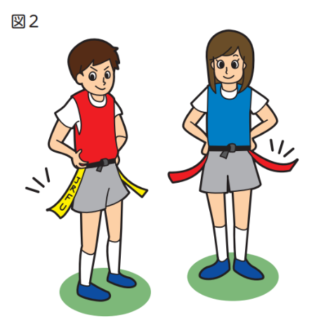 全てのプレーヤーは腰の左右にタグをつけるが、そのつけ方については図2に示した点に注意する。1チームの人数は、4人ないし5人で行い、試合時間は5分ハーフ程度が一般的であるが、運動量が豊富なゲームなので、子どもの実態に応じた適切な時間を設定する。