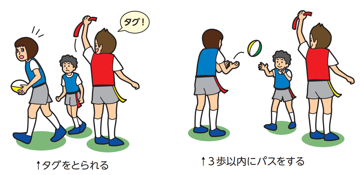 ボールを持っているプレーヤーは、タグをとりにくるプレーヤーから身をかわしてよいが、タグをとることをじゃましたり、とられないよ